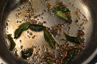 - Faites chauffer 15 g d’huile de coco dans une petit poêle à feu moyen. Ajoutez 1⁄2 c. à café de graines de moutarde, 1⁄2 c. à café lentilles urad dal, et faites revenir à feu doux en remuant jusqu’à ce que la moutarde craquelle et que les lentilles soient dorées. Ajoutez 12 feuilles de curry et 1 pincée d’asafaetida. Mélangez encore quelques secondes pour faire griller les feuilles sans les brûler puis coupez le feu.