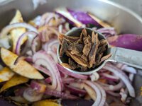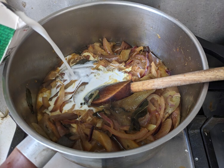 - Ajoutez les feuilles de 2 tiges de curry, l’oignon coupé en rondelles, et 4 c. à soupe d’huile de coco.